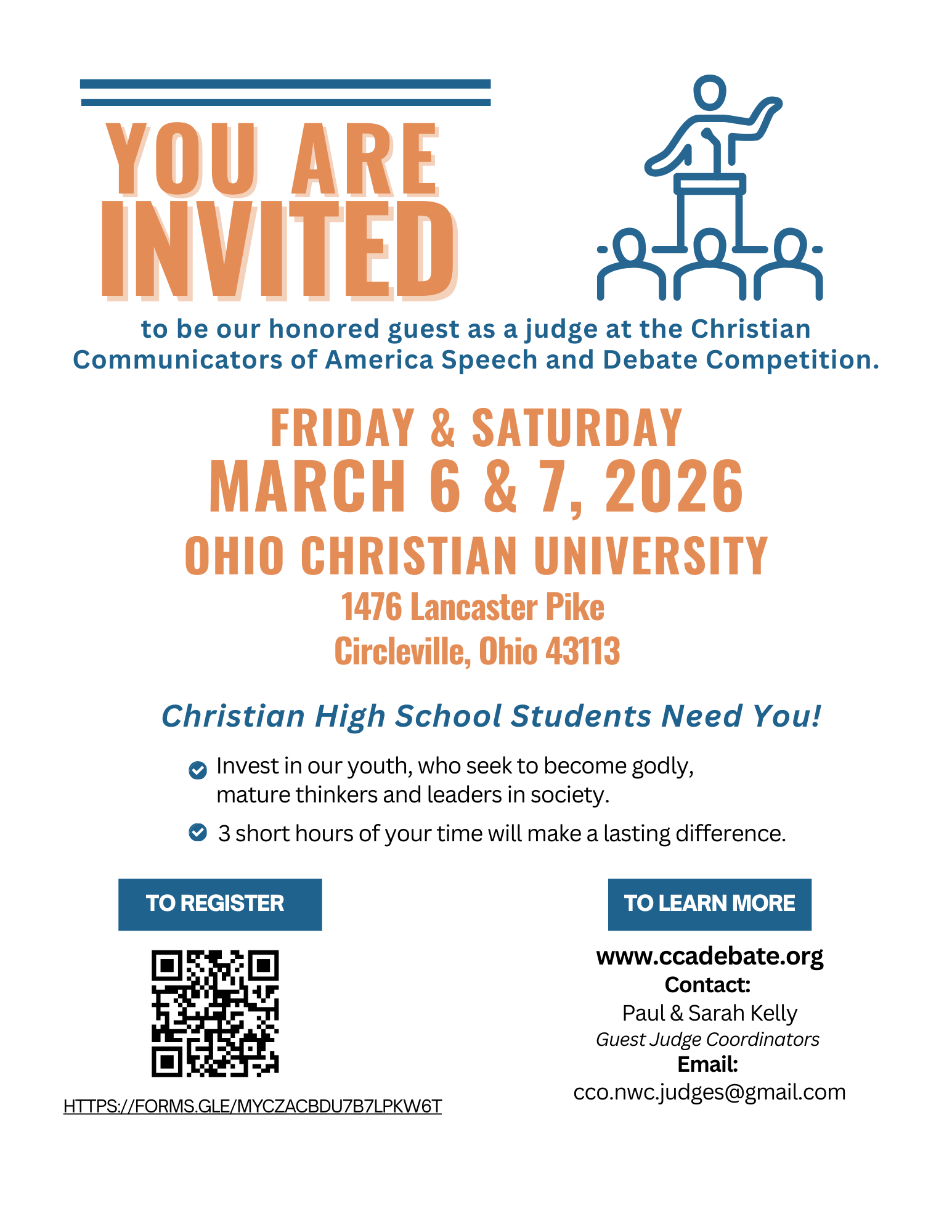 -Varsity students participating in IE ONLY may arrive late on Friday, March 6, 2026, no later than 3:00pm. If you plan on arriving late, you must contact the Tournament Directors at OCUtournament@adamsglobal.net by Monday, February 23, 2026 to confirm your late arrival.