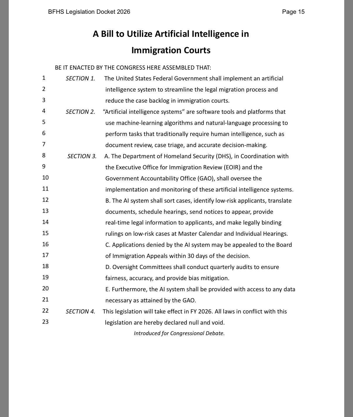 Congress will have one piece of legislation that will be available on the right-hand side of this tournament: A Bill to Utilize Artificial Intelligence in Immigration Courts