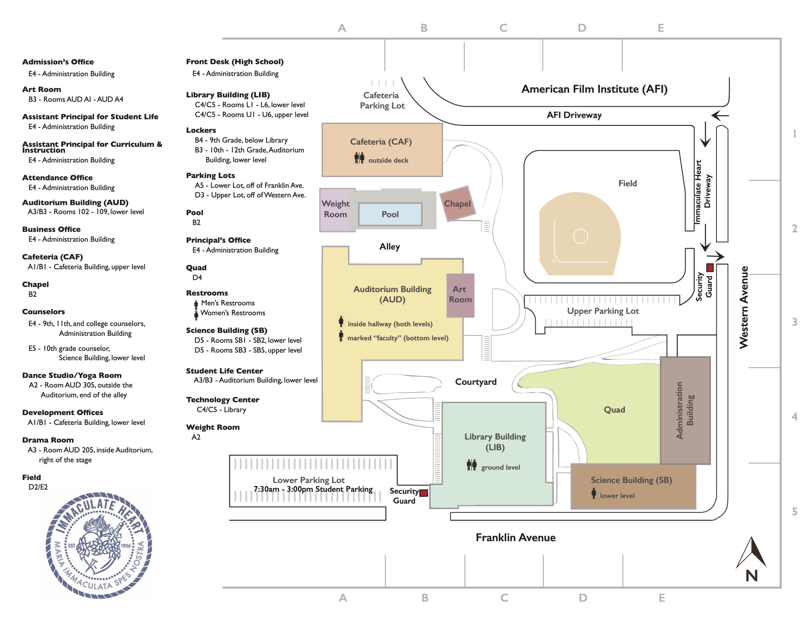 We have two parking lots on campus. The lower lot (on Franklin) has more space but both lots will be available for parking. If you are being dropped off, it is best to enter the upper lot (on Western).